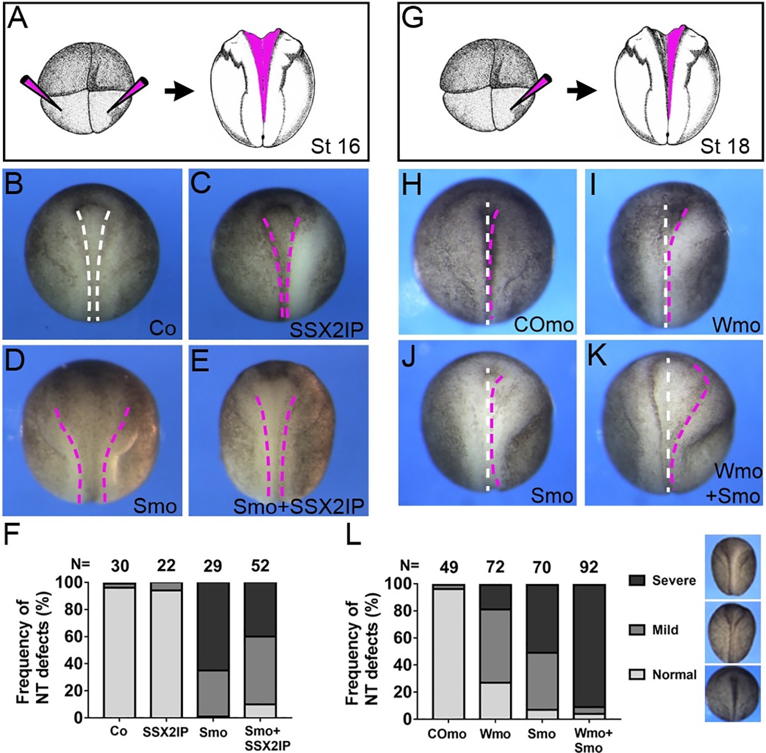 Embryos were injected bilaterally or unilaterally with 10 ng of Wtip MO (Wmo) or SSX2IP MO (Smo) or 20 pg of human SSX2IP RNA as indicated. Neural groove formation along the anteroposterior axis was assessed at stages 16â18. A-F, Neural tube closure defects in SSX2IP morphants. A, Scheme of the experiment. B-D, Dorsal views of representative embryos at stages 16â17, anterior is up. B, Control uninjected embryo, C, SSX2IP RNA injection. D, Embryo injected with Smo. E, Embryo injected with Smo and SSX2IP RNA. Human SSX2IP RNA partly rescues neural closure defects. Dashed lines indicate neural fold borders. F, Frequency of neural tube (NT) defects. Data are representative of two experiments. G-L, Functional interaction of SSX2IP and Wtip. G, Scheme of the experiment. H-L, Representative embryos at stages 18â19 injected with control MO (CoMO, H), Wmo (I), Smo (J) or both Wmo and Smo (K). Midline, white dashed line, neural fold border, magenta dashed line. Anterior is up. L, Frequency of neural tube (NT) defects in the morphants. Data represent three different experiments. In F and L, total number of embryos per group is shown above each bar. Mild, severe and normal phenotypes have been scored separately, with examples shown in L.