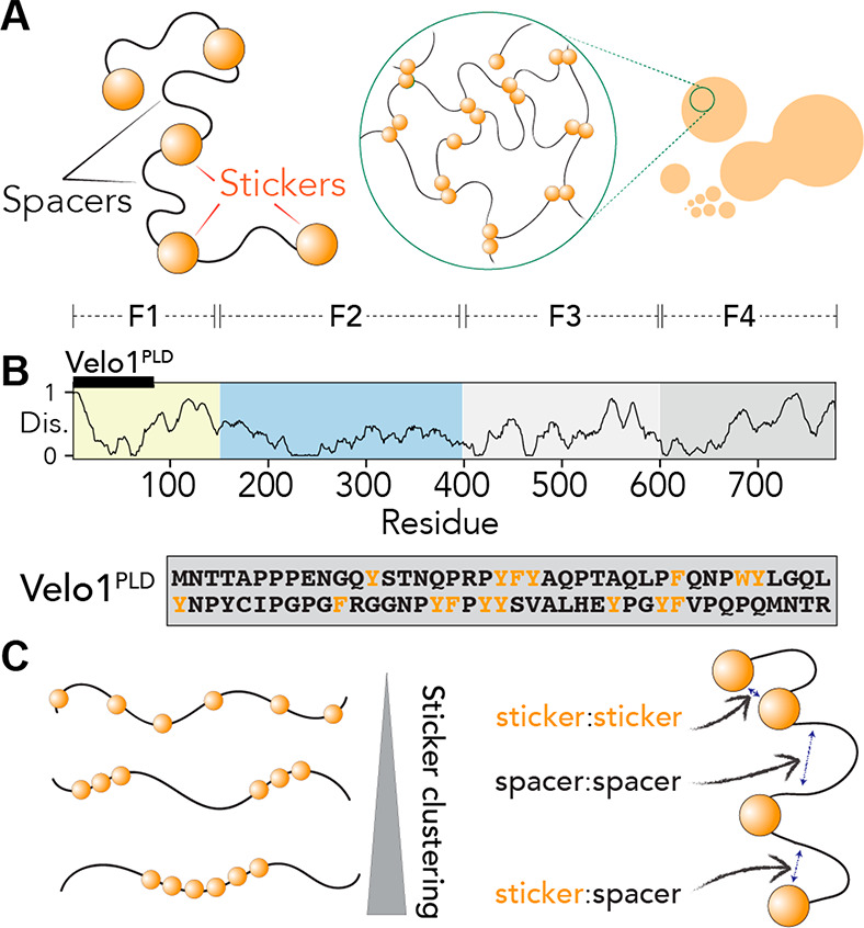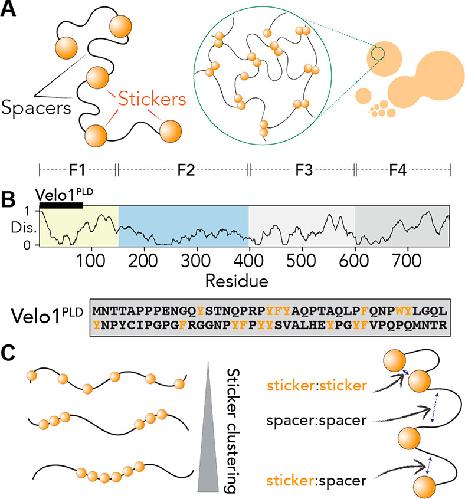 Figure 1. Stickers-and-spacers framework that can be used to describe Velo1PLD. (A) The stickers-and-spacers framework subdivides biomolecules into sticker regions and spacer regions, whereby stickers contribute attractive interactions that drive phase transitions through multivalent interactions. (B) The Velo1 sequence architecture contains an N-terminal prion-like domain (Velo1PLD) and four fragments (F1âF4) as originally defined by Böke et al.39 The Velo1PLD sequence is shown explicitly with aromatic residues colored orange and all other residues colored black. (C) Questions of interest in this study are how sticker clustering (left) and spacer-related interactions (right) can alter the formation and equilibrium state of condensates formed by PLDs. |