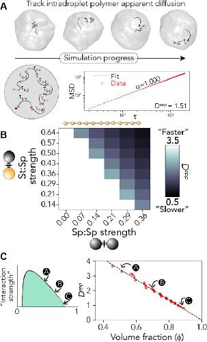 Figure 4. Apparent diffusion coefficient scales with droplet density. (A) Overview of the analysis approach as applied to the polymer architecture defined in Figure 3. Individual polymers are followed as they âdiffuseâ within a droplet and fit to extract the diffusive scaling exponent (α) and the apparent diffusion constant (Dapp). Dapp is determined only where simple Brownian diffusion is observed (i.e., α = 1), which occurs in almost all cases (see Figures S1âS3). (B) Dapp as a function of sticker:spacer and spacer:spacer strength. (C) Graphical representation of how density and Dapp relate to one another (left) and all data from panel B plotted as a single master curve of Dapp vs dense-phase volume fraction (Ïden). The linear fit to guide the eye leads to an apparent diffusion constant of 0 when the volume fraction is 1, reflecting the limit in which every lattice site is occupied such that no free sites are available for polymers to move into. |