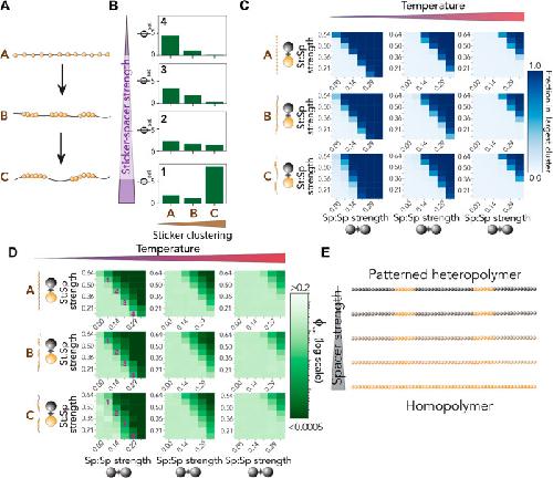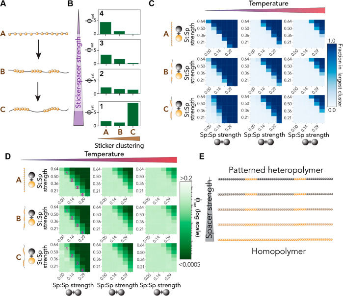 Figure 5. Impact of sticker clustering can be altered by sticker:spacer strength. (A) Three polymers of equal length with equal composition but alternative sticker clustering. (B) Saturation concentration as a function of sticker clustering (x-axis) and sticker:spacer strength (top to bottom). These specific comparisons are shown also in panel D. (C) Fraction of chains in the largest cluster shown as a function of sticker:spacer, spacer:spacer, sticker clustering (top to bottom), and system temperature (left to right). (D) Saturation concentration as a function of sticker:spacer, spacer:spacer, sticker clustering (top to bottom), and system temperature (left to right). Numbers reflect the systems examined in panel B. (E) The spacer:spacer and spacer:sticker interaction strengths can determine the impact of sticker:spacer patterning by rescaling the definition of a sticker and spacer. Spacer strength here reflects the simultaneous titration of spacer:spacer and sticker:spacer interaction strength to match that of sticker:sticker strength. |