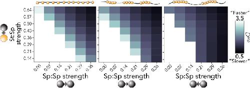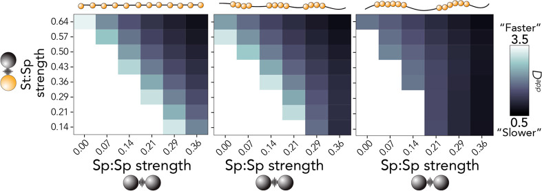 Figure 6. Dependence of intracondensate polymer apparent diffusion on spacer-mediated interactions that depends on sticker clustering. As the level of sticker clustering increases for polymers with a strong spacer:spacer interaction, there is little to no dependence of Dapp on sticker:spacer interactions. This suggests that in the limit of (relatively) strong spacer:spacer interactions, molecular rearrangement is dominated by spacer:spacer and sticker:sticker interactions. |