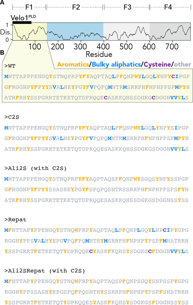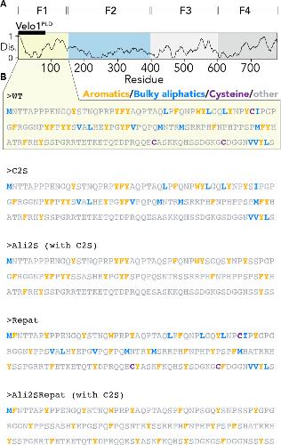 Figure 8. Architecture of Velo1 and amino acid sequences of F1 fragment variants. (A) Relative position of the F1 fragment. (B) Amino acid sequence of the wild type sequence and rationally designed F1 variants tested. |