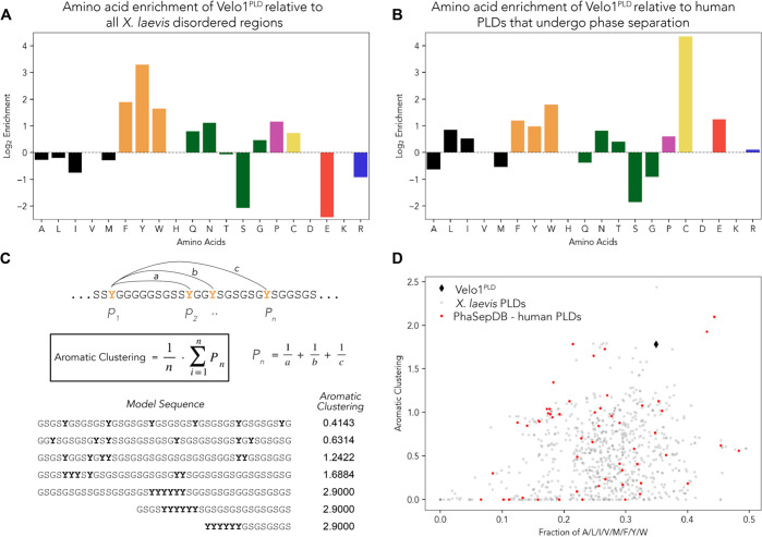 Figure 2. Velo1PLD is enriched with aliphatic and aromatic residues and depleted of small polar residues and has highly clustered aromatic residues. (A) Log2 of fractions of different amino acids in Velo1PLD divided by equivalent fractions of the same amino acid across all X. laevis IDRs. (B) Log2 of fractions of different amino acids in Velo1PLD divided by equivalent fractions of the same amino acid across human PLDs that undergo liquid–liquid phase separation. (C) Graphical definition of the aromatic clustering parameter. (D) Assessment of aromatic clustering (y-axis) compared with the fraction of aromatic or aliphatic residues (x-axis). Among those of X. laevis PLDs, the clustering score Velo1PLD (black diamond) is higher than all but one, and among those of the PLDs from PhaseSepDB, the clustering score is higher than all but two. |