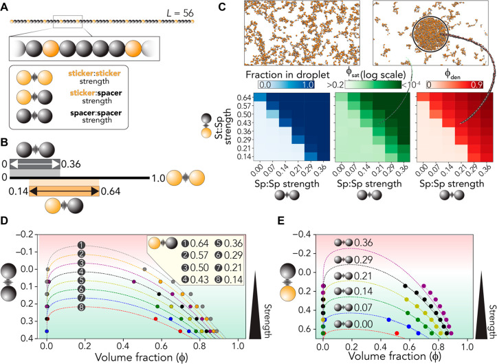 Figure 3. Sticker:spacer and spacer:spacer interaction strengths play a key role in determining the driving forces for phase separation. (A) Overview of the polymer models used in simulations. A 56-bead model is used (12 sticker beads, 44 spacer beads). Three parameters define the system: sticker:sticker, sticker:spacer, and spacer:spacer strength. (B) Summary of relative parameter ranges examined. The sticker:sticker strength is held fixed, and sticker:spacer and spacer:spacer interaction strengths are varied. (C) Simulations reveal that at a fixed starting volume fraction (ϕ) of 0.0168 the emergence of a two-phase regime is symmetrically dependent on the sticker:spacer and spacer:spacer interaction strength. As the interaction strength increases, ϕsat decreases, and in parallel ϕden (the concentration inside the droplet) increases. (D) Varying interaction strengths can be recast as modulating the effective Flory χ parameters or rescaling the critical temperature. As such, we can project the spacer:spacer interaction strength in the background of a fixed sticker:spacer interaction strength into a Flory–Huggins fit to analytically capture the interaction strength-dependent phase behavior. Points are simulation data, while lines are fits of data to Flory–Huggins theory. (E) Analogous analysis as in panel D but with a variable sticker:spacer strength in the background of a fixed spacer:spacer strength. Points are simulation data, while lines are fits of simulation data to Flory–Huggins theory. |