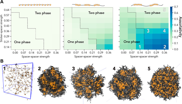 Figure 7. Sticker clustering tunes intradroplet organization. (A) Assortativity, a measure of the spatial mixing between stickers and spacers, is measured for the entire system as a function of sticker strength, spacer strength, and sticker clustering. For each system, the phase boundary is shown as a dashed line for reference. For the well-clustered sequences, significant deviations from a value of 0 are observed. (B) To understand the origins of these large assortativity values, we generated snapshots from distinct regions in panel A (orange beads are stickers, and black beads spacers). These revealed the intradroplet organization of stickers into local clusters and subdomains. For sequences with the most well-clustered stickers, we observe an assortativity of >0 at subsaturating concentrations due to the presence of small labile clusters. |