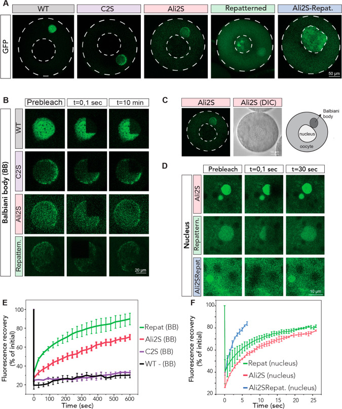 Figure 9. Rationally designed Velo1 designs tune cellular localization and material state. (A) mRNAs encoding Velo1 designs and wild type Velo1 fragment F1 (Figure 8) fused to GFP were microinjected into stage I X. laevis oocytes. Oocytes were left to recover and express injected mRNAs overnight and imaged the next day. The cell membrane and nucleus are outlined in a white dashed line. (B) Internal rearrangement of fluorescent wild type or redesigned Velo1 (F1-GFP) particles after photobleaching in the Balbiani body. Note that Velo1Ali2S/Repat did not localize to the Balbiani body. (C) Overview, DIC image, and schematic of the oocyte with its Balbiani body in the Ali2S design. (D) Internal rearrangement of fluorescent redesigned Velo1 (F1-GFP) particles after photobleaching in the nucleus. Note that Velo1WT does not localize to the nucleus. (E) The fluorescent recoveries of the photobleached Velo1WT or redesigned Velo1 (F1-GFP) particles in Balbiani bodies in panel B and two other biological replicates were quantified over time. (F) The fluorescent recoveries of photobleached Velo1 designs in nuclei in panel C and two other biological replicates were quantified over time. For panels D and E, the fluorescence in the bleached region was quantified over time and normalized by an unbleached neighboring region. At least three oocytes per biological replicate were plotted. Scale bars are as indicated in the figure. |