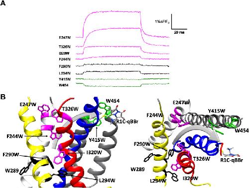 Figure 4. Activation pathway of R1C-qBBr:W454A mapped by several individually substituted tryptophans.(A) Representative qBBr traces at +80 mV. As qBBr moves closer to a W, the W quenches (green) the qBBr fluorescence (Y415W and W454). When it moves further away from a W, the qBBr fluorescence is unquenched (pink; F244W, E247W, I320W, and T326W). Some W mutations have no effect (black; 289W, F290W, and L294W). (B) A summary structure of activation of R1C-qBBr, with side (left) and extracellular (right) views of the voltage-sensing domain (VSD). The activation pathway based on the W quenching/unquenching for R1C-qBBr is marked by a gray arrow. |