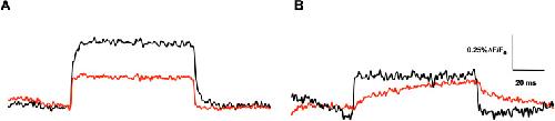 Figure 5—figure supplement 1. Effect of L294W in both R1C-qBBr:W454A and R2C-qBBr.Representative fluorescence traces of qBBr labeled (A) R1C-qBBr:W454A (black) and R1C-qBBr:W454A;L294W (red) at +80 mV. (B) R2C-qBBr (black) and R2C-qBBr;L294W (red) at +40 mV. |