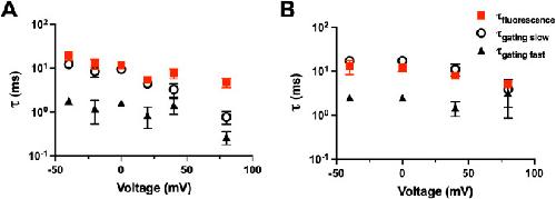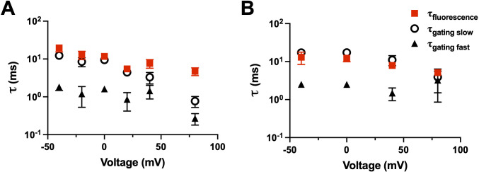 Figure 9. Fluorescence kinetics of qBBr.(A) Comparison of the single exponential tau of fluorescence of R1C-qBBr (red squares) to the gating ÏÏfast (black triangles) and the gating Ïslow (open circles) obtained from a double exponential fit to the gating charge (n = 4). (B) As in A, but for R1C-qBBr:W454A;E247W (n = 4). Figure 9âsource data 1. Source data for fluorescence and gating Ï in Figures 9A and 9B. |