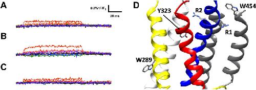 Figure 2—figure supplement 1. R1C-qBBr:W454A and R2C-qBBr fluorescence signals are not produced by endogenous tryptophans or tyrosines.Representative fluorescence traces of (A) R1C-qBBr:W454A;W289F, (B) R1C-qBBr:W454A;Y323F, and (C) R2C-qBBr W289F;Y323F. In all panels, membrane potentials during the pulse are: brown, + 80 mV; red, +40 mV; orange, 0 mV; green, −40 mV; blue, −80 mV; black, −120 mV; purple, −160 mV. (D) Structure showing the positions of endogenous amino acids from A to C and the positions of R1 and R2 (PDB: 3LUT). |