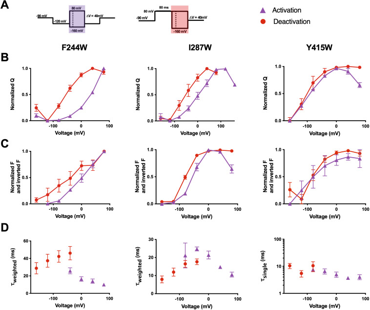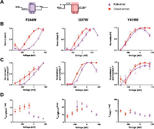 Figure 6—figure supplement 1. The voltage-sensing domain (VSD) deactivation path of R2C-qBBr differs from that of activation.(A) Activation (purple) and deactivation (red) protocols. Shading indicates where gating and fluorescence were measured for (B–D). (B) Comparison of activation (purple triangles) and deactivation (red circles) QVs for R2C-qBBr:F244W (left, act n = 4,deact n = 4), R2C-qBBr:I287W (center, act n = 4, deact n = 5), and R2C-qBBr:Y415W (right, act n = 3, deact n = 3). (C) As in (B), but a comparison of activation and deactivation FVs, rather than QVs. (D) Comparison of single exponential τact (red circles, n = 6) to τdea (purple triangles, n = 3) of R2C-qBBr:F244W (left), weighted τact (red circles, n = 8) to τdea (purple triangles, n = 4) of R2C-qBBr:I287W (center), and weighted τact (red circles, n = 4) to τdea (purple triangles, n = 6) of R2C-qBBr:Y415W (right). Data are shown as mean ± standard error of the mean (SEM). Figure 6—figure supplement 1—source data 1. Source data for normalized QVs in Figure 6—figure supplement 1A, normalized FVs in Figure 6—figure supplement 1B, and single or weighted τ of fluorescence in Figure 6—figure supplement 1C. |