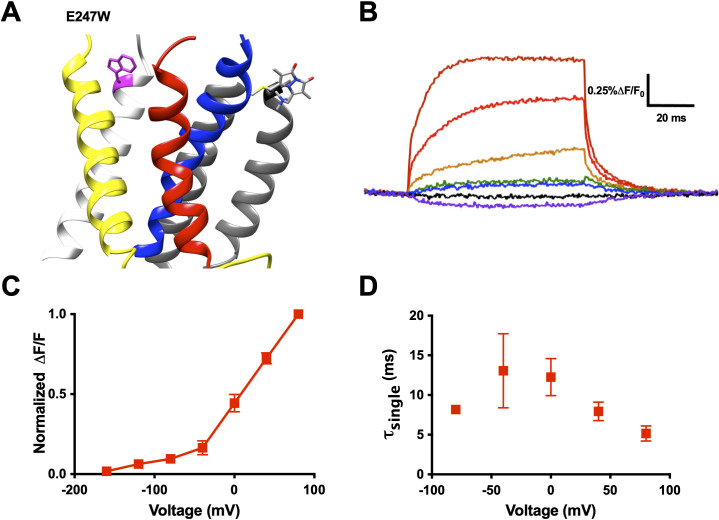 Figure 3. An exogenously substituted tryptophan (E247W) produces voltage-dependent fluorescence changes in R1C-qBBr:W454A.(A) Homology structure of Shaker construct, R1C-qBBr:W454A;E247W demonstrating the tryptophan placement within the protein. (B) A representative activation family of fluorescence traces. (C) A normalized ÎF/F0 fluorescence versus voltage curve. Normalization was performed for each oocyte separately (n = 4). (D) A single exponential Ï of fluorescence upon activation (n = 3). Data are shown as mean ± standard error of the mean (SEM). Figure 3âsource data 1. Source data for normalized ÎF/F0 versus voltage in Figure 3C and single exponential Ïact of fluorescence in Figure 3D. |