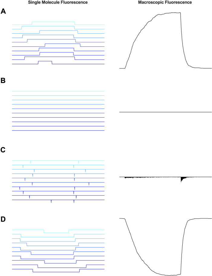 Figure 1—figure supplement 1. Single molecule fluorescence trace simulations in comparison to macroscopic fluorescence traces.Simulated fluorescence traces at the single molecule scale (left) and the summed macroscopic fluorescence (right) for the tryptophan placement in an unquenching position (A), when tryptophan is at the peak of the barrier but cannot be detected (B), when tryptophan is at the peak of the barrier in the case of unlimited bandwidth (C) and placement in a quenching position (D). |