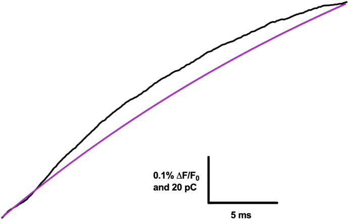 Figure 7—figure supplement 1. R1C-qBBr:W454A;F290W hyperpolarization-induced gating charge and fluorescence signal time course.Data are taken from a pulse from −120 to −160 mV. The integrated gating current of all four charges moving through the electric field (gating charge, Q, black) is more rapid than the hyperpolarization-induced fluorescence signal of R1C-qBBr:W454A;F290W, shown as the single exponential fit to the inverted fluorescence signal (purple). The fluorescence signal only follows the movement of the most extracellular gating charge (R1C-qBBr). Traces are aligned to each other, but the fluorescence signal is still slower than the gating charge. |