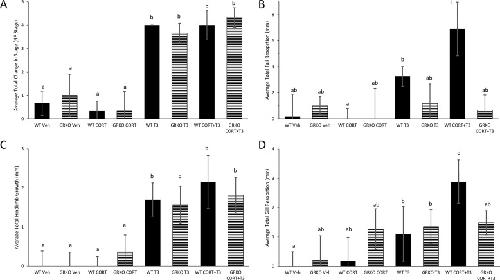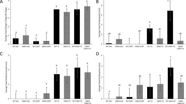 Fig. 5. GRKO tadpoles exhibit lack of CORT/TH synergy for tail and gill resorption. WT and GRKO were measured before and after treatment for 6 days with vehicle, 100 nM CORT, 2 nM T3, and 100 nM CORT plus 2 nM T3. Bars represent average total change from Day 0 to Day 6 in (A) NF stage, (B) tail length, (C) hindlimb length, and (D) gill width. Letters represent significance groups among all treatments within each panel. Error bars represent standard deviation. n = 5, WT = wild-type, GRKO = glucocorticoid receptor knockout, Veh = vehicle (ethanol treatment), CORT = corticosterone, T3 = active form of TH.