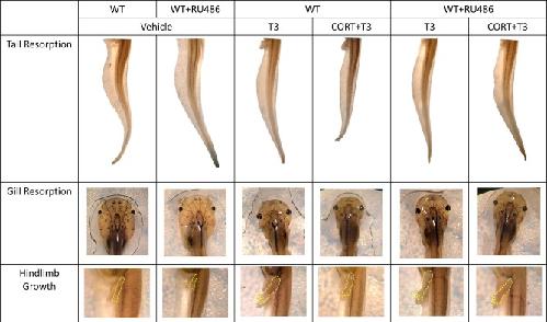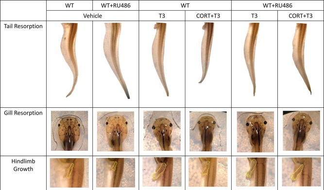 Fig. 6. Exemplar images of WT and RU486-treated tadpoles treated with or without T3 and/or CORT. Representative images of WT and RU486-treated tadpoles treated for 6 days with vehicle, 2 nM T3, and 100 nM CORT plus 2 nM T3 are shown. Note the stronger effect of T3 + CORT compared to T3 alone in tail and gill in wild-type (WT) and not RU486-treated tadpoles. n = 5, Veh = vehicle (ethanol treatment), RU486 = GR antagonist, T3 = active form of TH.