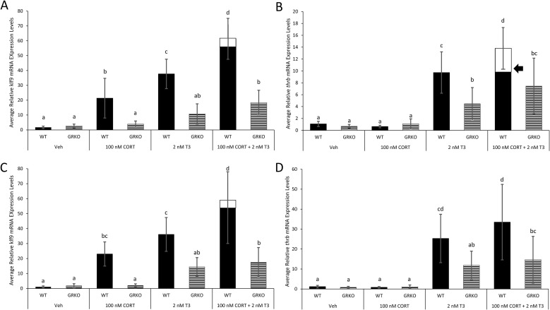 Fig. 2. GRKO tadpoles exhibit lack of CORT/TH synergy for thrb expression in the tail. WT and GRKO tadpoles at NF 54 were treated for 24 h with vehicle, 100 nM CORT, 2 nM T3, and 100 nM CORT plus 2 nM T3, and then gene expression was examined for (A) klf9 in tail, (B) thrb in tail, (C) klf9 in liver, and (D) thrb in liver. White portions of treatment bars for hormone co-treatments significantly higher than in T3 alone represent expression above additive response estimated from T3 and CORT responses singly. Black arrow indicates a synergistic response, defined as greater than one standard deviation above the estimated additive portion of the response. Error bars represent standard deviation (SD). Letters represent significance groups among all treatments within each panel. n = 12, WT = wild-type, GRKO = glucocorticoid receptor knockout, Veh = vehicle (ethanol treatment), CORT = corticosterone, T3 = active form of TH.