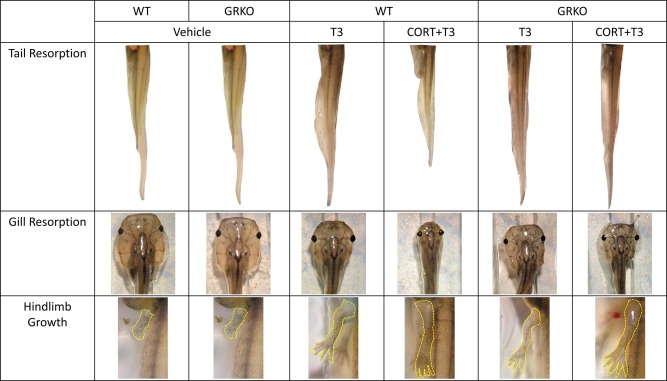 Fig. 4. Exemplar images of WT and GRKO tadpoles treated with or without T3 and/or CORT. Representative images of WT and GRKO tadpoles treated for 6 days with vehicle, 2 nM T3, and 100 nM CORT plus 2 nM T3 are shown. Note the stronger effect of T3 + CORT compared to T3 alone in tail and gill in wild-type (WT) and not GRKO tadpoles. n = 5, Veh = vehicle (ethanol treatment), T3 = active form of TH.