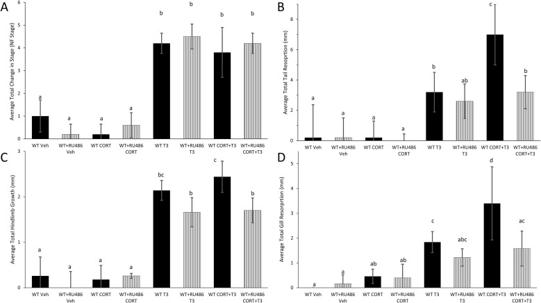 Fig. 7. WT tadpoles treated with RU486 exhibit lack of CORT/TH synergy for tail and gill resorption. WT and RU486-treated tadpoles were measured before and after treatment for 6 days with vehicle, 100 nM CORT, 2 nM T3, and 100 nM CORT plus 2 nM T3. Bars represent average total change from Day 0 to Day 6 in (A) NF stage, (B) tail length, (C) hindlimb length, and (D) gill width. Letters represent significance groups among all treatments within each panel. Error bars represent standard deviation. n = 5, WT = wild-type, RU486 = GR antagonist, CORT = corticosterone, T3 = active form of TH.