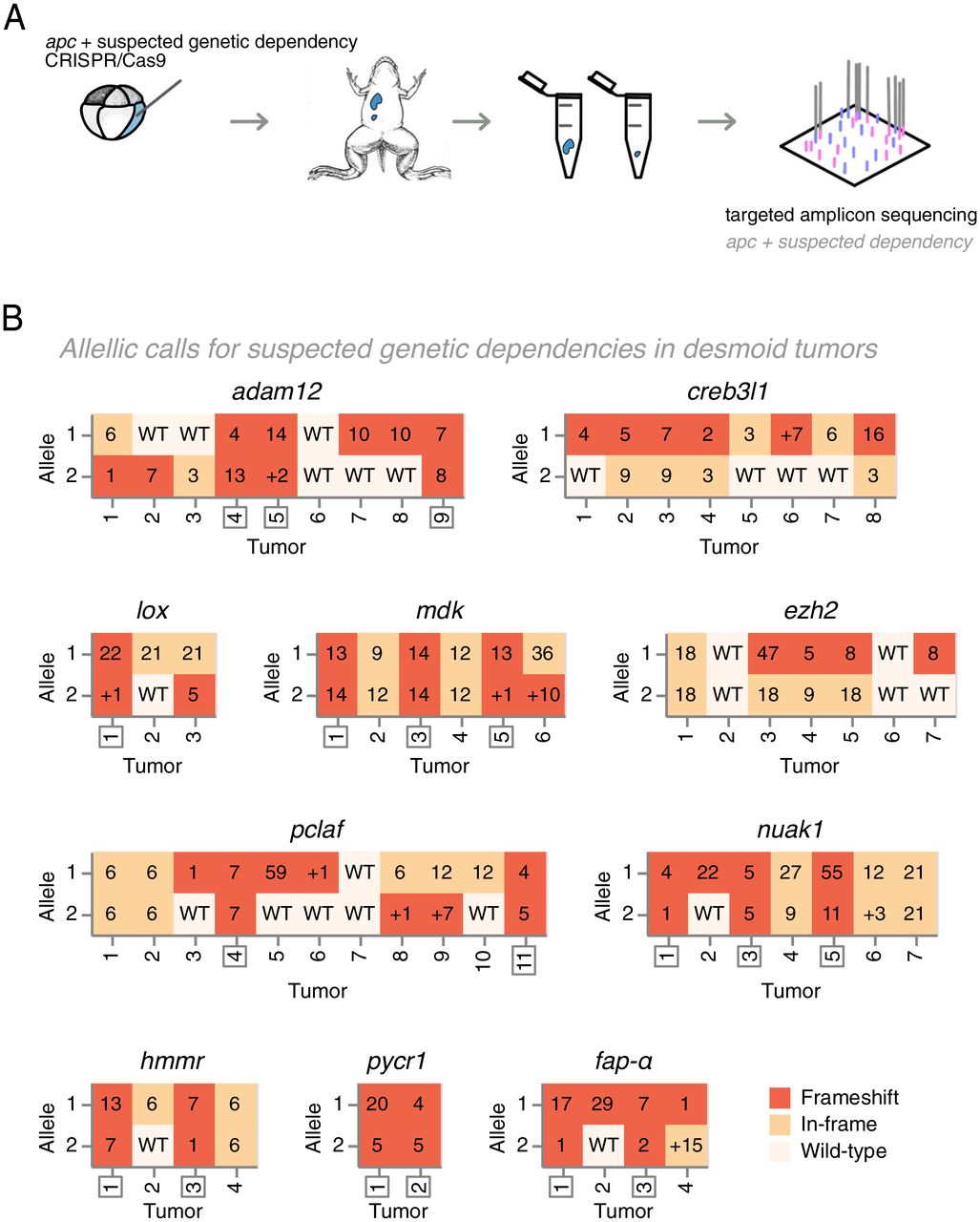 Fig. 2. Assessing and classifying editing outcomes at CRISPR/Cas9 target sites of candidate dependency genes in apc mutant desmoid tumors. (A) X. tropicalis embryos are cotargeted at apc and, respectively, one suspected genetic dependency (e.g., adam12). Desmoid tumors were dissected from 3-mo-old postmetamorphic animals, and both CRISPR/Cas9 target sites were subjected to targeted amplicon sequencing to determine gene editing outcomes. (B) Indels and allelic status at the suspected dependency CRISPR/Cas9 target sites in dissected desmoid tumors. Frameshift mutations (FS) are indicated in dark-red, in-frame (IF) mutations in ochre, while wild-type allelic calls are indicated in off-white. Numbers in boxes show specific INDEL mutations, where În indicates a deletion of n nucleotides and +n indicates insertions of n nucleotides. For eight suspected genetic dependencies, desmoid tumors were retrieved with biallelic frameshift mutations (demarcated by boxed numbers). In contrast, for ezh2 and creb3l1, biallelic frameshift mutations were never retrieved. |