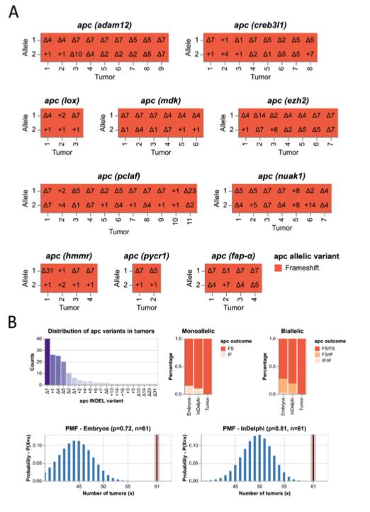 Figure S1: The mutational spectrum of apc in desmoid tumors reveals positive selection for biallelic frameshift mutations. (A) Xenopus tropicalis embryos are co-targeted at apc and respectively one suspected genetic dependency (adam12, creb3l1, lox, mdk, ezh2, pclaf, nuak1, hmmr1, pycr1 or fap- α). Desmoid tumors were dissected from post-metamorphic animals (aged three months) and both CRISPR/Cas9 target sites were subjected to targeted amplicon sequencing to determine gene editing outcomes. Shown here are the editing outcomes at the apc locus. (B, top panels) The probability to sample a biallelic frameshift mutation (right) in a desmoid tumor is directly related to the probability on monoallelic frameshift editing outcomes (left). E.g. upon an apc gRNA-specific frameshift frequency of 85%, the probability of a single desmoid tumor to be biallelic frameshift mutant is 72% (0.85*0.85). (B, bottom panels) (left) Given the apc editing outcomes sampled in embryos, i.e. in absence of selective pressure, the probability of a single desmoid tumor to have biallelic frameshift editing outcomes is 72%. Therefore, the probability of sampling 100% (61/61 tumors) with biallelic frameshift allelic status is very unlikely (probability < 0.001) according to binomial theory. (right) Similarly, given apc editing outcomes predicted by InDelphi, the probability of a single desmoid tumor to have biallelic frameshift editing outcomes is 81%. Therefore, the probability of sampling 100% (61/61 tumors) with biallelic frameshift allelic status is very unlikely (probability < 0.001) according to binomial theory. |