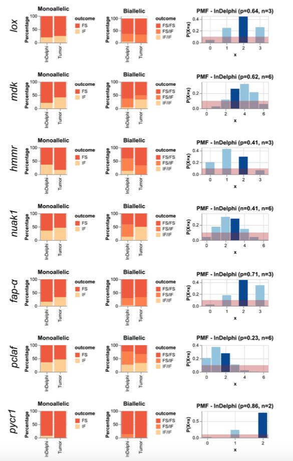 Figure S2: No selection towards specific patterns of gene editing outcomes at suspected dependency target sites in apc CRISPR/Cas9-induced desmoid tumors for lox, mdk, hmmr, nuak1, fap-α, pclaf, pycr1. Gene editing outcomes at suspected dependencies demonstrate, for each gene, at least two tumors developing with biallelic frameshift mutations. Gene editing outcomes in desmoid tumors are in line, and probable according to binomial theory, with predicted gene editing outcomes as determined by the InDelphi algorithm. E.g for lox, given the editing outcomes as predicted by InDelphi, the probability of a single biallelic mutant desmoid tumor to have biallelic frameshift editing outcomes is 64%. The probability of sampling 66% (2/3 tumors) with biallelic frameshift lox status is likely (probability is 44%). Red demarcation represents a 10% probability interval. |