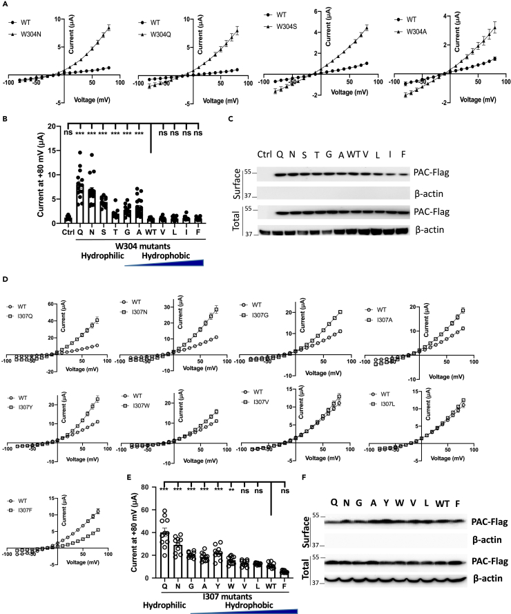 Figure 2. Effects of the hydrophobicity at sites 304 and 307 on the PAC function(A) Statistical I-V curves obtained from oocytes expressing a W304 mutant at pH 7.5, in comparison with WT PAC.(B) Averaged currents at +80 mV obtained from oocytes expressing WT PAC or a W304 mutant or water-injected oocytes at pH 7.5. ∗∗∗, p < 0.001; ns, not significant compared with WT PAC.(C) Total and surface expression of PAC-Flag or β-actin in oocytes similarly prepared as in panel (B).(D) Statistical I-V curves from oocytes expressing an I307 mutant at pH 4.5, in comparison with WT channel in dashed lines.(E) Averaged currents at +80 mV obtained from oocytes expressing WT or an I307 mutant at pH 4.5.(F) Total and surface expression of PAC-Flag or β-actin in oocytes similarly prepared as in panel (E).Data are represented as mean ± SEM. Also, see Figure S3.