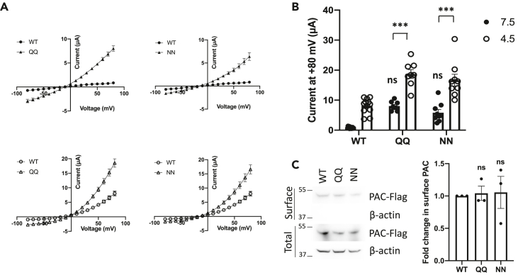 Figure 3. Functional effects of double hydrophilic mutations at W304 and I307(A) Statistical I-V curves obtained from oocytes expressing WT, W304Q/I307Q, or W304N/I307N at pH 7.5 (filled) or 4.5 (open).(B) Averaged currents at +80 mV obtained from oocytes expressing WT or a double mutant at pH 7.5 or 4.5. ∗∗∗, p < 0.001; ns, not significant compared with the WT current at pH 4.5.(C) Total and surface expression of PAC-Flag or β-actin in oocytes similarly prepared as in panel B (left panel) and statistical analysis (right panel). ns, not significant, compared with WT by Student's t-test.Data are represented as mean ± SEM.