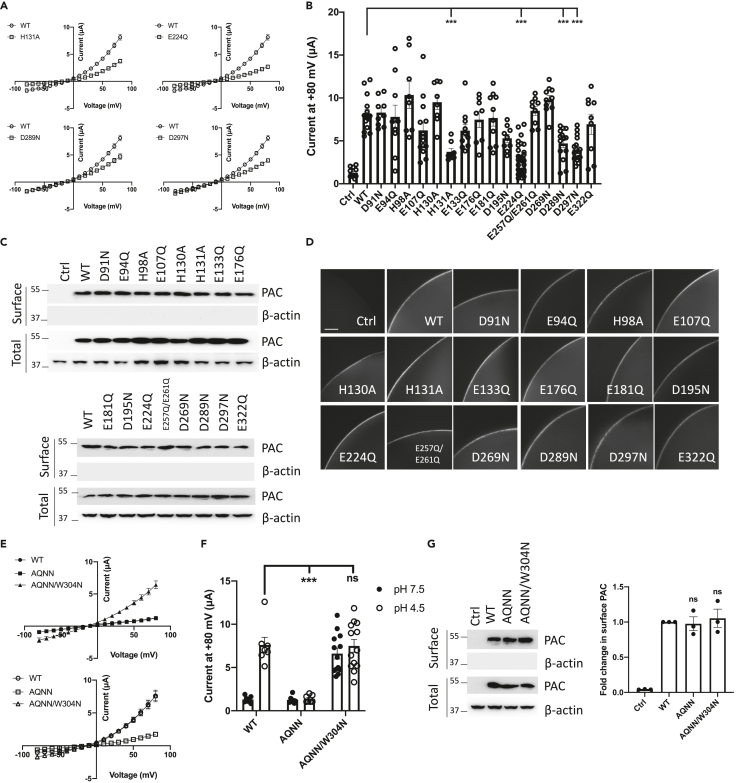 Figure 4. Functional effects of protonatable residues within the extracellular loop of PAC(A) Statistical I-V curves obtained from oocytes expressing WT or mutant PAC at pH 4.5.(B) Bar charts showing averaged currents for neutralized mutants, as indicated. ∗∗∗, p < 0.001 by Student's t-test, in comparison with WT channel.(C) Total and surface expression of PAC-Flag or β-actin in oocytes similarly prepared as in panel (B).(D) Representative immunofluorescence images showing the surface expression of WT or mutant PAC.(E) Statistical I-V curves obtained from oocytes expressing WT, mutant H131A/E224Q/D289N/D297N (AQNN) or W304N/AQNN at pH 7.5 (filled) or 4.5 (open). Scale bar, 50 μm.(F) Averaged currents at +80 mV for indicated mutants.(G) Total and surface expression of PAC-Flag or β-actin in oocytes similarly prepared as in panel F (left panel) and statistical analysis (right panel). ns, not significant, compared with WT by Student's t-test.Data are represented as mean ± SEM. Also, see Figures S4–S6.