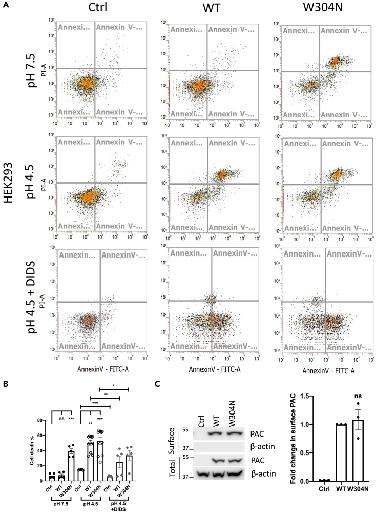 Figure 5. Effect of mutant W304N on the death of HEK293 cells(A) Representative flow cytometry charts showing the FITC-Annexin/PI distribution of HEK293 cells transfected with plasmids encoding empty vector (Ctrl), WT PAC, or mutant W304N at pH 7.5 (upper), 4.5 (middle) or 4.5 + DIDS (100 μM) (lower).(B) Averaged percentages of HEK293 cell death. ns, not significant; ∗∗∗, p < 0.001; ∗∗, p < 0.01, by Student's t-test.(C) Representative Western blot images showing the total or surface expression of PAC-Flag or β-actin in HEK293 cells. Data were averages obtained from three independent experiments.Data are represented as mean ± SEM. Also, see Figure S7.