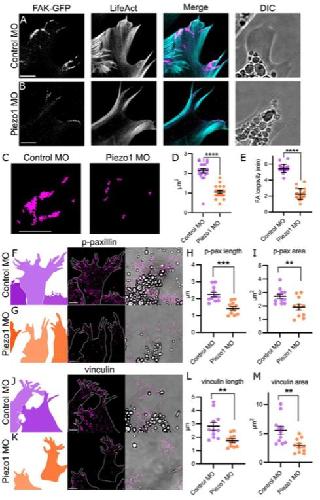 Figure 3. Focal adhesion regulation by Piezo1. (A-B) Cell protrusions from NC cells plated on fibronectin and expressing focal adhesion kinase tagged with GFP (FAK-GFP) and LifeAct-Ruby in control MO (A) and Piezo1 MO (B). (C) Representative masks of the FAK-GFP from (A-B). (D) Quantification of area of FAK- GFP normalised to control from (C). (E) Quantification of focal adhesion longevity in minutes from (A-B); n=20 cells in each condition. (F,G, J, K) Xenopus NC explants plated on a fibronectin coated dish. Cell shapes, cell contours and bright field images are shown in left, middle and right columns, respectively. Explants immunostained against p-paxillin (F,G) or vinculin (J,K) in control MO (F,J) and Piezo1 MO (G,K). (H- I) Quantification of length (H) and area (I) of individual focal adhesions from (F-G). (L-M) Quantification of length (L) and area (M) of individual focal adhesions from (J- K). Note that focal adhesions are shorter and smaller in Piezo1 MO compared to control. n=110 cells of 11 explants in each condition. Each dot is the mean value of an independent experiment, representing the average of all FAs measured within an explant (all the FA of 10 cells were measured per explant). All data is representative of at least 3 biological replicates. Scale bars=5μm. Error bars are ±SEM. Student's t- test (two-tailed): ***p ⤠0.001, **p ⤠0.01, ****p ⤠0.0001.