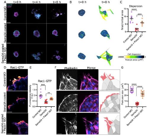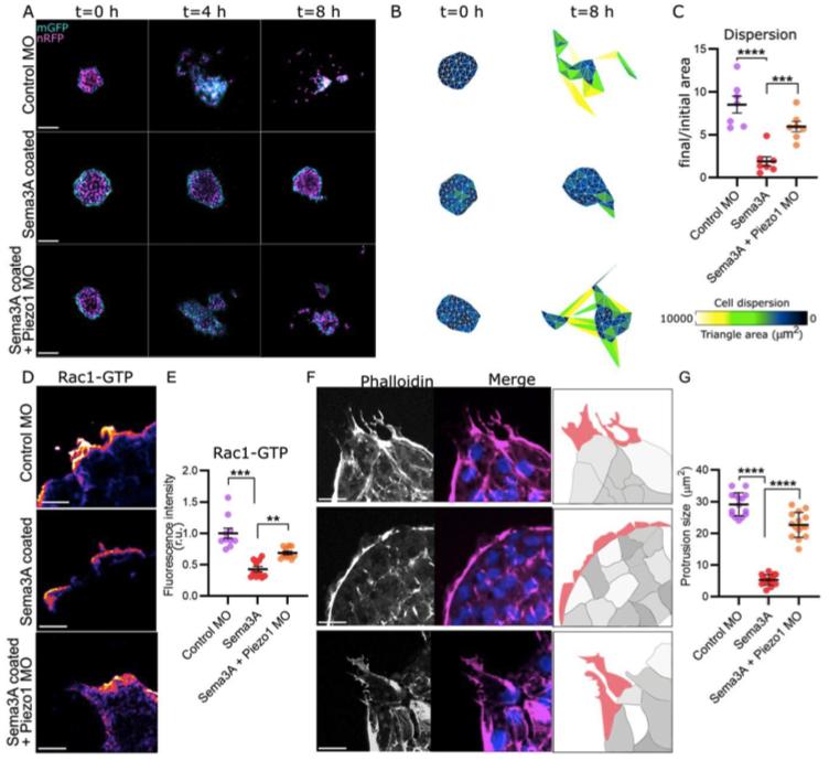 Representative images of NC explants expressing nuclear-RFP (nRFP) and membrane-GFP (mGFP), plated on top of fibronectin (top) or fibronectin plus Sema3A (middle and bottom), at time 0 (left column), after 4 hours (middle column) and after 8 hours (right column). Note that Piezo1 MO cells disperse in the presence of Sema3A. (B) Analysis of cell dispersion area by Delaunay triangulation, representative areas from (I). (C) Normalised area of cell dispersion, showing a ratio of final and initial area from (A). n=35 explants in each condition. (D) Representative images of NC explants immunostained against Rac1-GTP, plated on top of fibronectin (top) or fibronectin plus Sema3A (middle and bottom). (E) Quantification of fluorescent intensity of Rac1-GTP from (D). Rac1 levels are partially rescued in Piezo1 MO. (F) Representative images of cell protrusions from NC explants stained with phalloidin, plated in the same conditions as (D). Note that protrusions are inhibited in explants plated on Sema3A, while Piezo1 MO explants protrusions are rescued. (G) Quantification of protrusion size from (F). (n=10) explants in each condition. (A) Scale bars=50μm. (D,F) Scale bars=10μm Error bars are ±SEM. Each dot is the mean value of an independent experiment. All data is representative of at least 3 biological replicates. One-way ANOVA with a Dunnett's multiple comparisons post-test. **p ⤠0.01, ***p ⤠0.001, ****p ⤠0.0001.