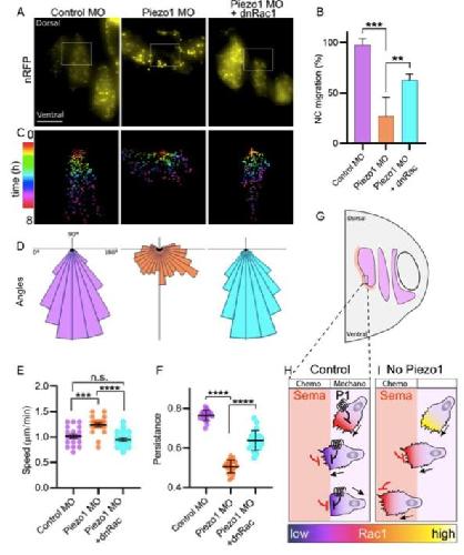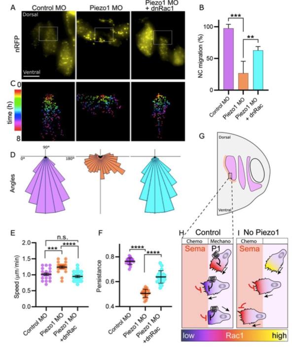 determined by comparing the NC migratory streams to a whole mount in situ hybridization. Note that expression of dnRac1 on top of Piezo1 MO partially rescues NC migration. n=5 embryos per condition (C) Color coded single cell tracks from (A). Note that Piezo1 MO cells migrate laterally, while directional migration is restored in Piezo1 MO plus dnRac. (D) Angles of cell migration from (C). (E) Quantification of speed of cell migration from (A). (F) Quantification of persistence of cell migration from (A). Note that both speed and persistence of cell migration are rescued in Piezo1 MO plus dnRac. (E-F) n=20 in each condition. Error bars are ±SEM. Each dot is the mean value of an independent experiment. All data is representative of at least 3 biological replicates. one-way ANOVA with a Dunnett's multiple comparisons post- test. **p ⤠0.01, ***p ⤠0.001, ****p ⤠0.0001. n.s. non-significant. (G-I) Proposed model of the role of Piezo1 in NC migration. In control embryos (H) Piezo1 mechanical activation partially reduces Rac1 activity, which is further inhibited by chemical signals from SemA. This leads to a collapse of cell protrusions and inhibition of cell migration into the SemA region. In the absence of Piezo1 (I), there is no initial regulation of Rac1 levels, when NC cells reach the SemA region, Rac1 levels are only partially inhibited, and cells continue to invade the SemA region.