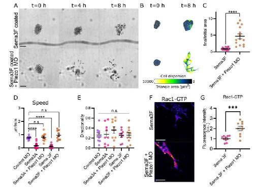 Fig. S3. Loss of Piezo1 counteracts Sema3F and Sema3A inhibitory signals. (A) Representative images of NC explants plated on top of fibronectin plus Sema3F, at time 0 (left column), after 4 hours (middle column) and after 8 hours (right column). Note that Piezo1 MO cells disperse in the presence of Sema3F. (B) Analysis of cell dispersion area by Delaunay triangulation, representative areas from (A). (C) Normalised area of cell dispersion, showing a ratio of final and initial area from (A). n=14 explants in each condition. (D) Quantification of speed of cell migration from (A and Fig 6A). (E) Quantification of directionality of cell migration from (A and Fig 6A). (E,G); n=50 cells per condition. (F) Representative images of NC explants immunostained against Rac1-GTP, plated on top of fibronectin plus Sema3F. (G) Quantification of fluorescent intensity of Rac1-GTP from (F). Rac1 levels are partially rescued in Piezo1 MO. n=10 explants in each condition. (A) Scale bars=50μm. (F) Scale bars=10μm. Error bars are ±SEM. Each dot is the mean value of an independent experiment. All data is representative of at least 3 biological replicates. (C,G) Student's t-test (two-tailed). (D-E) One-way ANOVA with a Dunnett's multiple comparisons post-test. ***p ⤠0.001, ****p ⤠0.0001, n.s. non- significant.