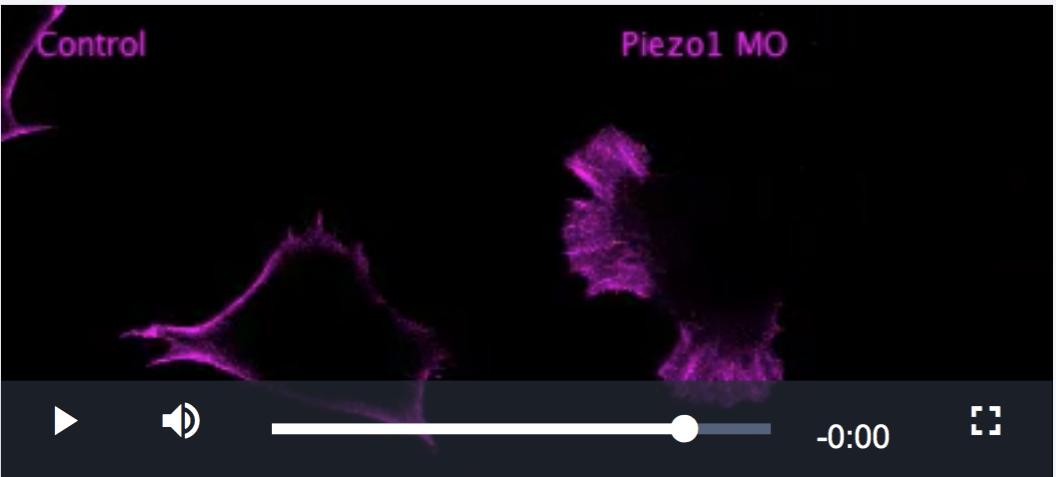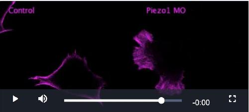 Loss of Piezo1 leads to increased protrusion activity. Time lapse of neural crest cells plated on a fibronectin coated dish, expressing LifeAct-Ruby in control MO and Piezo1 MO. 40X magnification. Total length: 30min.