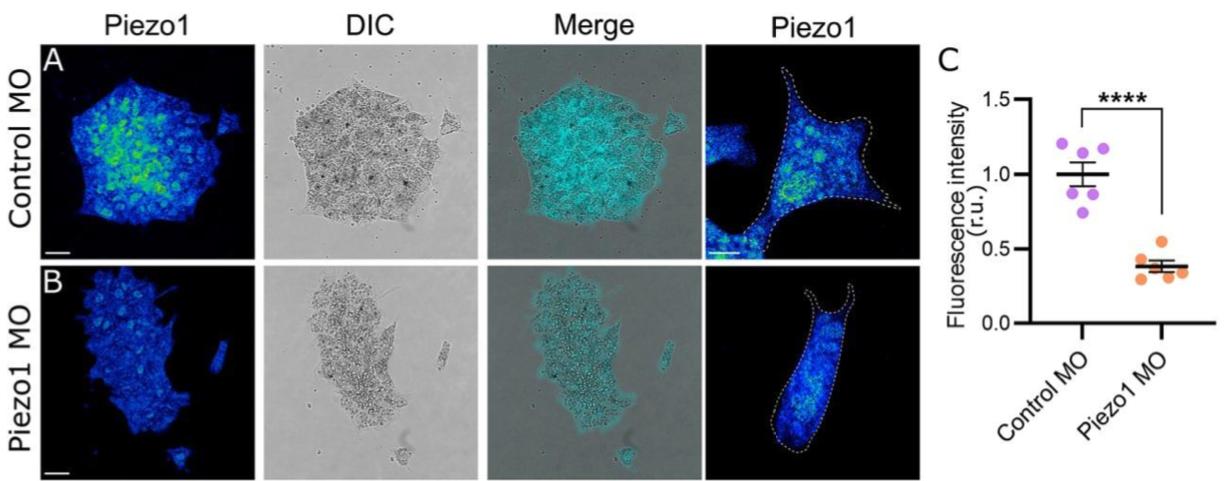 Figure 1. Piezo1 is expressed in migratory neural crest cells. (A-B) Xenopus NC explants plated on a fibronectin coated dish and immunostained against Piezo1 in control MO (A) and Piezo1 MO (B). (C) Quantification of fluorescent intensity of Piezo1 from (A-B); r.u.: relative units; n=60 cells per condition. Scale bars, 20 μm. Error bars are ±SEM. Each dot is the mean value of an independent experiment. All data is representative of at least 3 biological replicates. (C) Student's t-test (two- tailed). ****p ⤠0.0001.