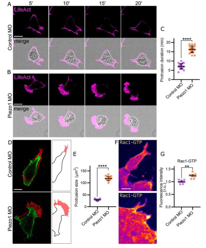 Figure 4. Loss of Piezo1 leads to increased protrusion activity via Rac1 activation. (A-B) NC cells plated on a fibronectin coated dish, expressing LifeAct- Ruby in control MO (A) and Piezo1 MO (B) at different time points (top). Note that cell protrusions are more abundant in Piezo1 MO compared to control MO. (C) Quantification of the protrusion duration in minutes from (A-B). (n=18) cells in each condition (D) Time projection of NC cells from (A-B) at time 0 (green) and after 7 minutes of migration (red). Protrusion area is highlighted in red in the illustration. (E) Quantification of the area of cell protrusions from (A-B) (n=18) cells in each condition. (F) Immunostaining of Rac1-GTP (active Rac1) in control MO NC explants (top) and Piezo1 MO (bottom). (G) Quantification of fluorescence intensity of Rac1- GTP from (F). r.u.: relative units; (n=70) cells in each condition. Scale bars=10μm. Each dot is the mean value of an independent experiment. All data is representative of at least 3 biological replicates. Error bars are ±SEM. Student's t-test (two-tailed): **p ⤠0.01, ****p ⤠0.0001.