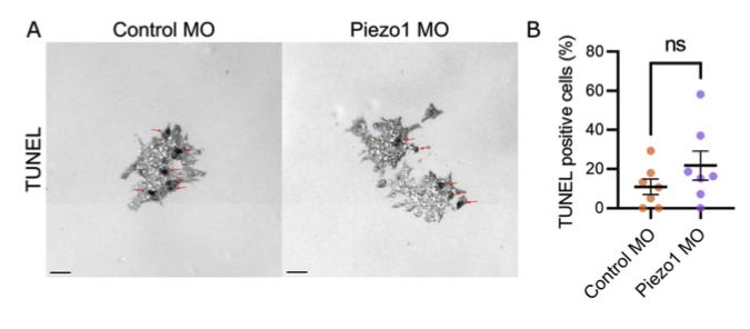 Fig. S1. Piezo1 knock down has no effect on apoptosis. (A) Representative images of NC explants plated on top of fibronectin and fixed with paraformaldehyde. Explants were labelled by TUNEL staining. Red arrows point to TUNEL positive cells. (B) Quantification of percentage of TUNEL positive cells in migratory neural crest explants. No significant difference was found between control MO and Piezo1 MO cells. (n=140) cells per condition. Scale bars, 20 μm. Error bars are ±SEM. Each dot is the mean value of an independent experiment. All data is representative of at least 3 biological replicates. Student's t-test (two-tailed). n.s. non-significant.