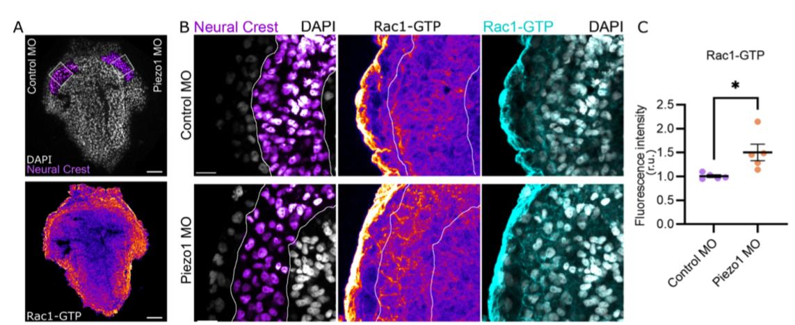 Fig. S4. Increased active Rac1 upon Piezo1 knock down in vivo. (A) Sagittal cryosections of whole embryos injected on the left side with control MO and on the right side with Piezo1 MO. Top. Nuclei are labelled with DAPI, neural crest is indicated in purple. Bottom. Rac1-GTP immunostaining labels active Rac1. Note that there is increased Rac1-GTP signal on the Piezo1 MO injected side (right side). Scale bars=100μm (B) Higher magnification images of neural crest tissue from (A), each condition is indicated in the figure. Scale bars=20μm. (C) Quantification of Rac1-GTP levels of neural crest cells from (B). n=50 cells. Error bars are ±SEM. Each dot is the mean value of an independent experiment. All data is representative of at least 3 biological replicates. Student's t-test (two-tailed). * p ⤠0.05.