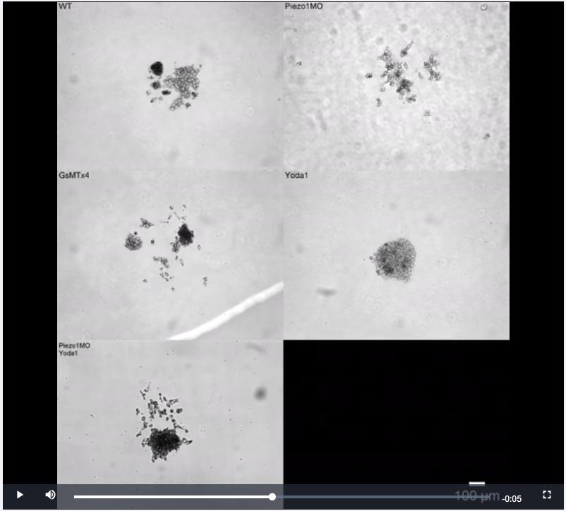 Piezo1 inhibition increases speed of neural crest cell dispersion. Time lapse videos of neural crest cultured on fibronectin with the indicated treatments. 10X magnification. Total length: 8h.