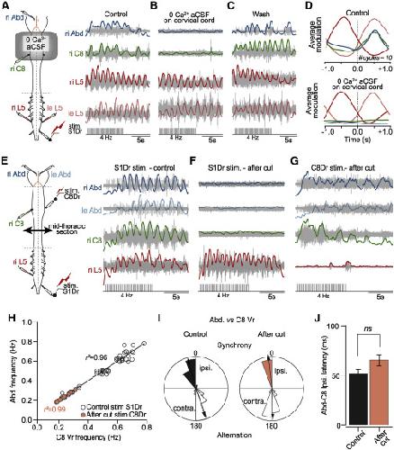 (I) Polar plots of the phase relationships between the Abd. and C8Vr before (control, left) and after mid-thoracic section (after cut, right). The phase relationship between both ventral roots is conserved after the mid-thoracic cut (Abd.C8 ipsi before (µ = 345.161± 2.546; r = 0.974) vs Abd. C8 ipsi after cut (µ = 353.912± 2.463; r = 0.999) and Abd.C8 contra before (µ = 162.803 ± 40.285; r = 0.943) vs Abd. C8 contra after cut (μ = 177.873 ± 4.909; r = 0.939; n = 3 mice).