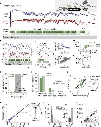 (AâE) Example of the eye movements observed during an episode of treadmill-induced locomotion.