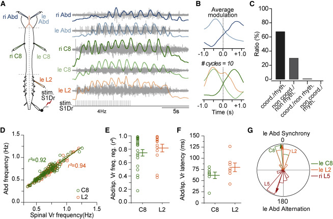 (G) Circular plots showing the phase relationships between the firing discharge burst in the le Abd. nerve and ipsilateral C8 (μ = 357.359° ± 2.213°; r = 0,936; n = 7) and L2 (μ = 354.288° ± 1.467°; r = 0.97; n = 8) and contralateral L5 (μ = 198° ± 5.04°; r = 0.868; n = 3) sp. Vr. In this and all polar plots, the width of the wedges is 0.05.