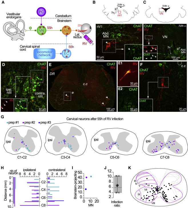 (G) Location of the RV+ neurons after 55 h of infection. RV+ neurons were represented by colored dots in the different segments of the cervical spinal cord for each preparation (prep no. 1 cyan, prep no. 2 purple, and prep no. 3 blue). Ipsi, cervical spinal cord side ipsilateral to the RV injected in the leftlateral rectus muscle.