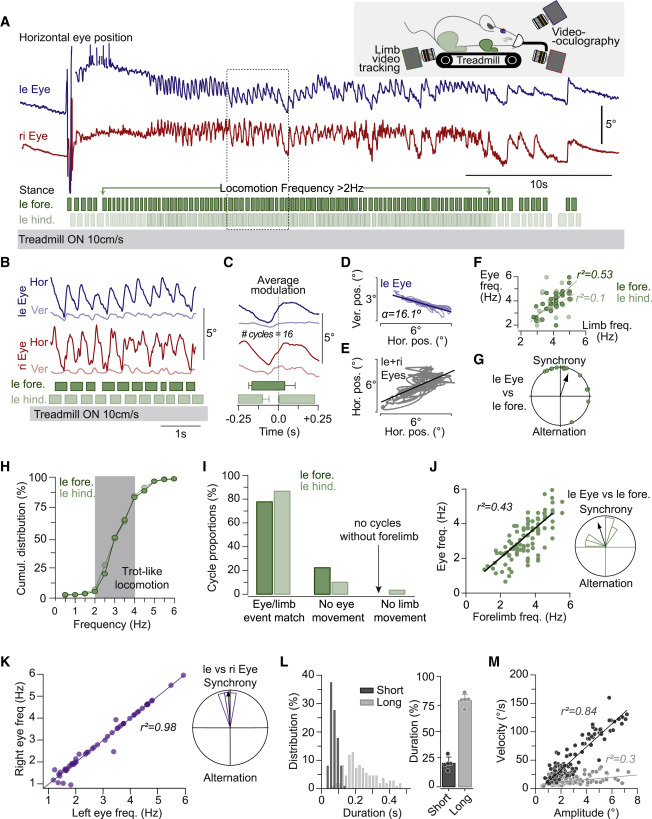 (A) le (le eye position, blue trace) and ri (ri eye position, red trace) horizontal movements are observed after the onset of locomotion. Rectangles represent the stance phases of the leftforelimb (dark green) and lefthindlimb (light green), gaps between rectangles represent swing phases, and green arrows contain a bout of continuous locomotion with instantaneous frequency above 2 Hz). Upper right inset: depiction of the setup used for recording eye movements in decerebrated mice. A video oculography camera recorded the movement of each eye, and an infrared camera tracked the movement of the limbs while mice ran on a motorized treadmill.