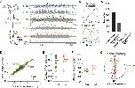 (F) Relation between the instantaneous frequency of the forelimb (dark green dots) or the hindlimb (light green dots) and the left horizontal eye movements (righteye versus leftforelimb, R = 0.7248, Spearman test, p < 0.001, r2 = 0.5253; righteye versus lefthindlimb, R = 0.3195, Spearman test, p = 0.0852, r2 = 0.1021).