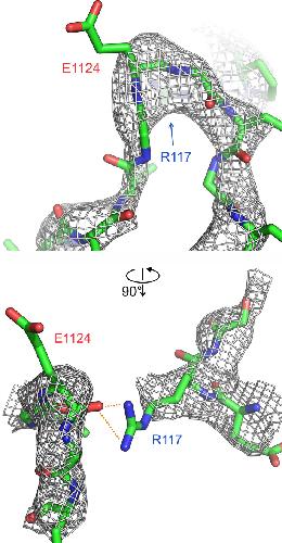 Figure 1—figure supplement 1. Close-up view of the R117-E1124 interaction in the quasi-open human CFTR structure.Electron density (gray mesh, EMD-9230) and atomic model (sticks; pdbid: 6msm) of the ECL6 loop around position 1124 (top and bottom), and of the ECL1 loop around position 117 (bottom). Both loops are well represented, and density for the R117 side chain is visible down to the delta carbon.