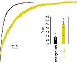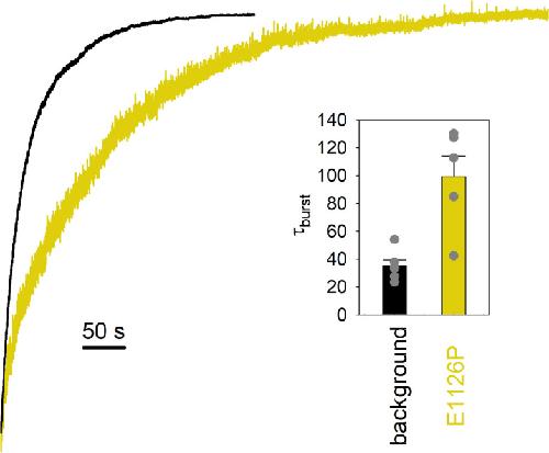 Figure 2—figure supplement 1. The E1126P mutation slows channel closure.Macroscopic current relaxations following ATP removal for E1371S (black trace) and E1371S-E1126P-CFTR (yellow trace). Inside-out patch currents were activated by ~1 min exposure of pre-phosphorylated channels to 5 mM ATP. Current amplitudes are shown rescaled by their steady-state values. Membrane potential (Vm) was –20 mV. (Inset) Relaxation time constants obtained by fits to single exponentials. Data are shown as mean ± SEM from 6 and 5 experiments, respectively.