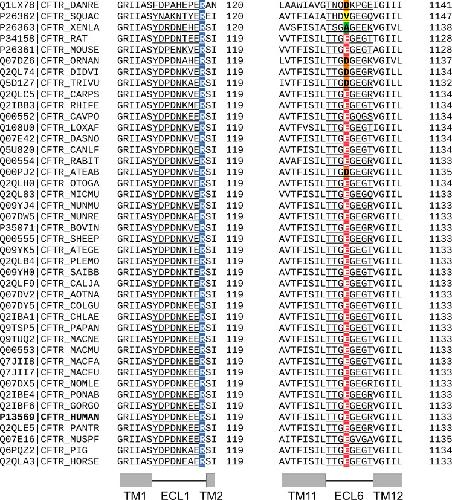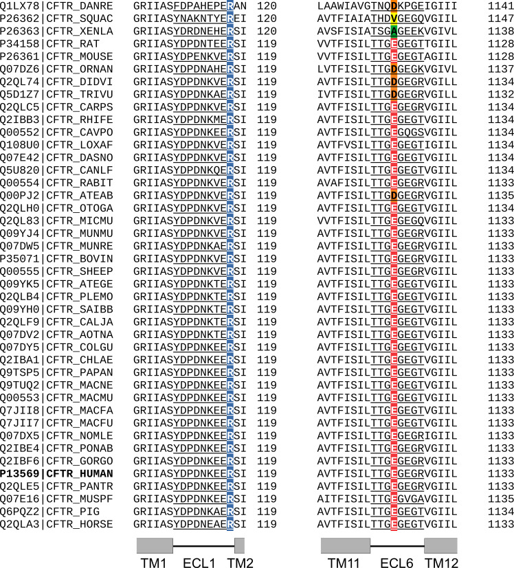 Figure 2âfigure supplement 2. Sequence alignment of the ECL1 and ECL6 loops for CFTR orthologs.Segments of a multiple sequence alignment generated by Clustal Omega for CFTR sequences from >40 species. Positions corresponding to human CFTR positions 117 and 1124 are highlighted in blue and red, respectively. The former position is conserved, the latter is not. However, the lengths of both ECL1 and ECL6 are invariable (underlined).