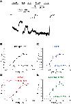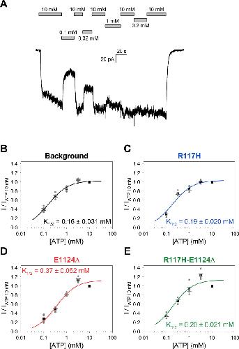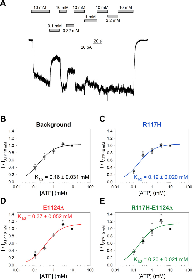 Figure 3—figure supplement 1. All tested constructs in the D1370N background are saturated by 5 mM ATP.(A) Macroscopic current of pre-phosphorylated D1370N CFTR in response to exposure to various concentrations of ATP (bars). (B–E) ATP dose-response curves of the four indicated constructs in the D1370N background. Relative currents were obtained by normalizing the steady-state currents in each test segment to the mean of the steady-state currents during bracketing applications of 10 mM ATP. Each symbol represents mean ± SEM from five experiments. Solid red curves are fits to the Michaelis-Menten equation, K1/2 values are plotted in the panels.